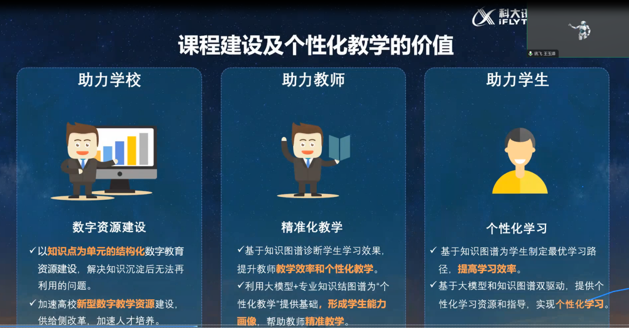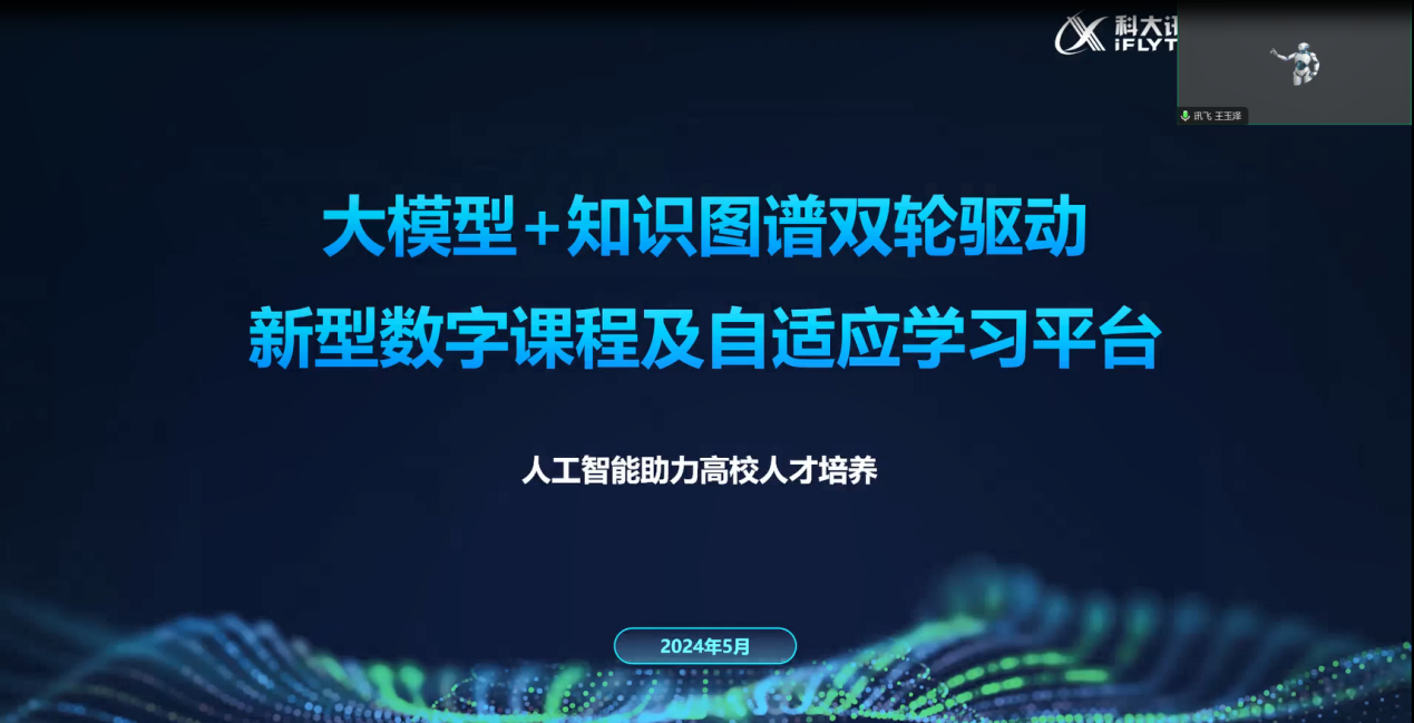 为深化教师对数字时代认识,借助现代科技力量推动课程与教学改革,202451514:30,科大讯飞北方方案咨询负责人、人工智能技术高级工程师、高教研究院研究员王玉泽,为yL23411永利集团教师讲授了一场题为《大模型+知识图谱双轮驱动新型数字课程及自适应学习平台——人工智能助力高校人才培养》的线上讲座。