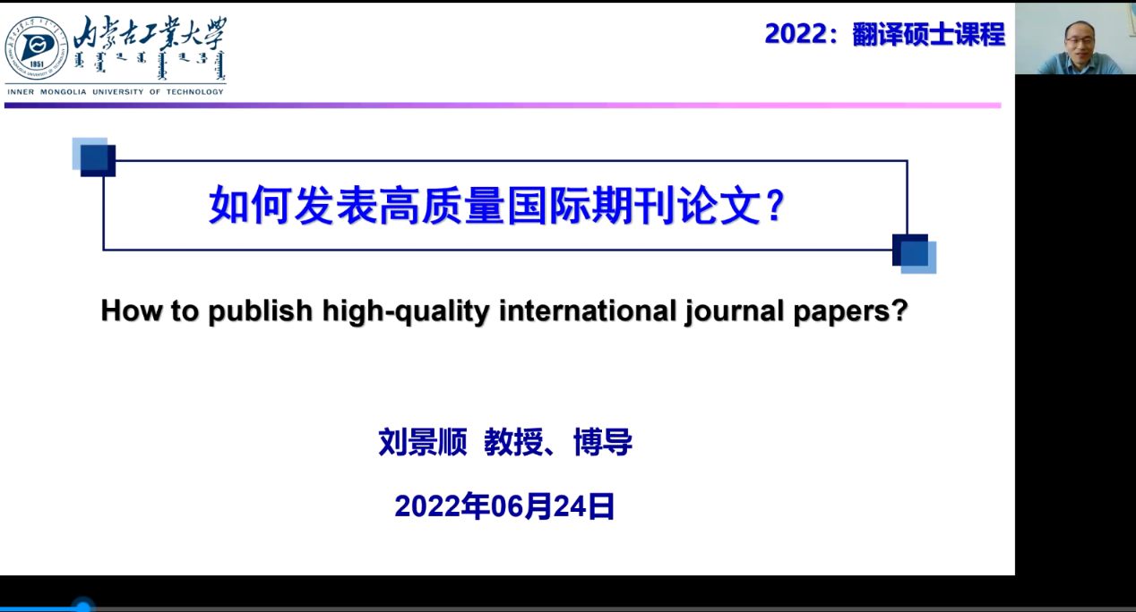 6月24日晚19:00,yL23411永利集团邀请我校材料学院副院长、博士生导师刘景顺教授通过腾讯会议作题为“如何发表高质量国际期刊论文”的线上学术讲座,2020级、2021级全体研究生以及部分专业教师、研究生导师百余人在线参加。此次讲座是对我院翻硕硕士研究生专业选修课《科技翻译工作坊》的课程补充和延续。