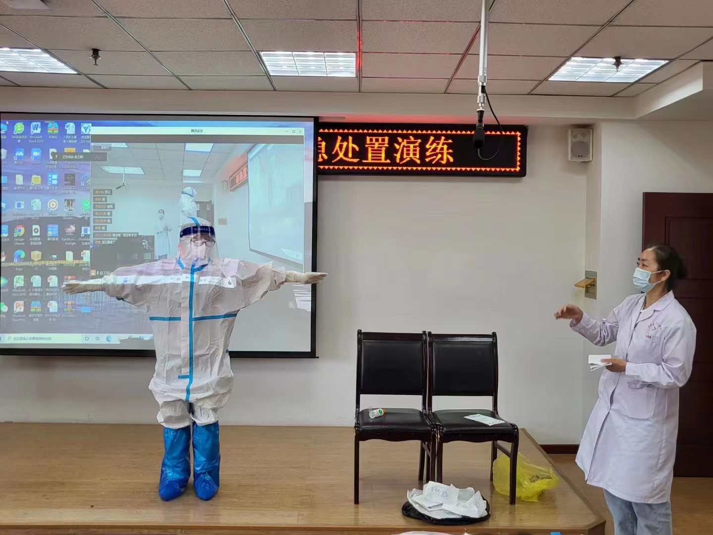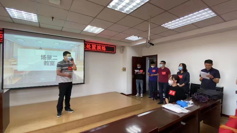 讲座后,根据学校疫情防控工作的有关要求,学院有针对性地设置了学生在宿舍晨午晚检、教室出现密切接触者、教学楼封闭及人员疏散等几个场景,在场全体教师开展了疫情防控应急处置演练。