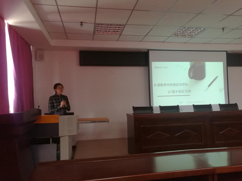 包桂英老师介绍了外语教学中的测试与评估方式。她以“国才考试”为例,分别就国才初级、中级、高级的口头沟通任务和书面沟通任务,对任务设计和评分原则进行了详细地阐述。最后,她强调了测试对教学的反拨作用。