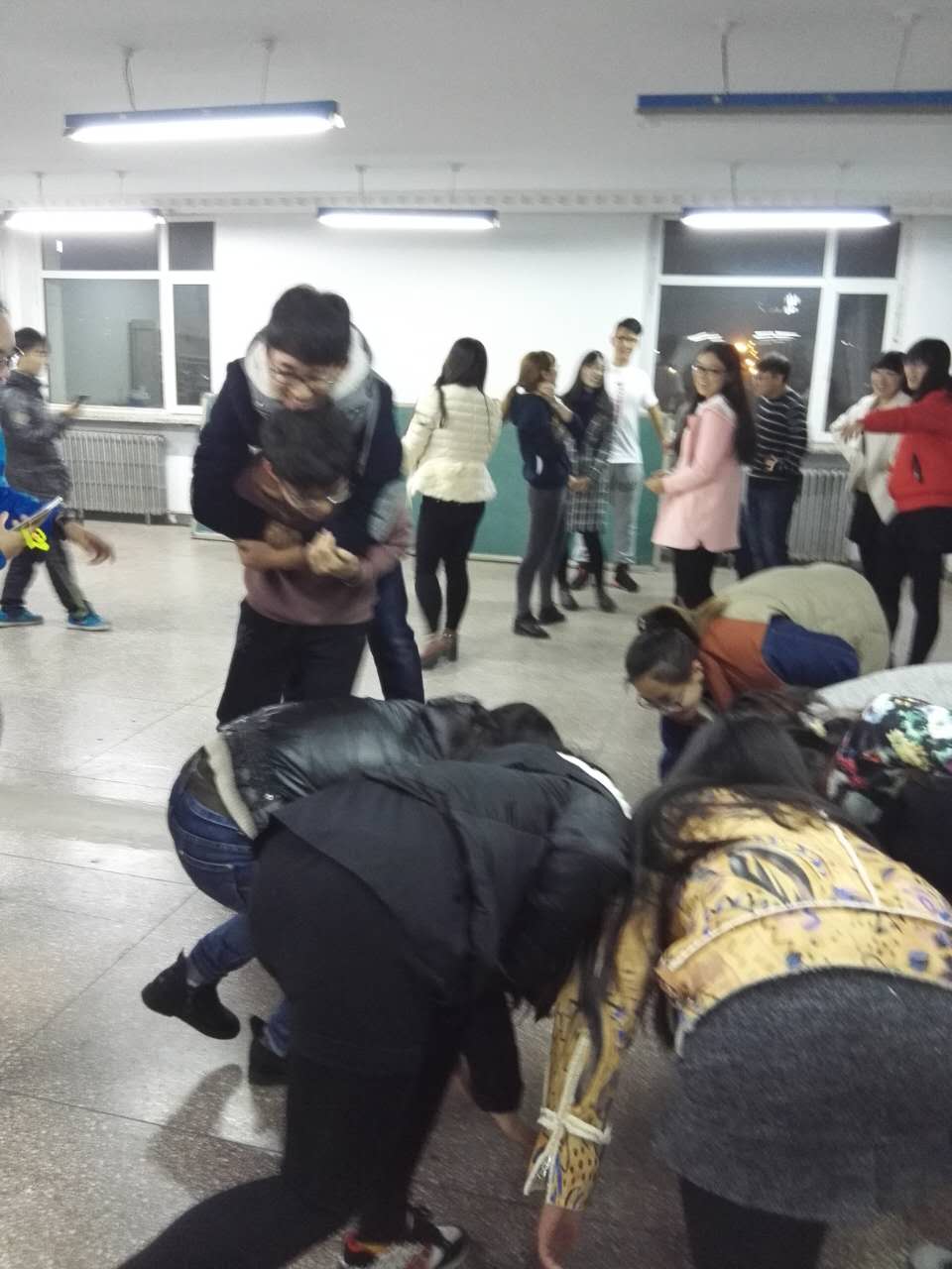 在主持人简短的开场白与规则介绍过后,团体心理辅导伴在游戏进行中拉开了序幕。很多人在游戏“乒乓球”中和游戏“七手八脚”中因平衡能力差而接受惩罚,特别是难度较大的“解开千千结”,当混乱的状态代替了秩序井然的圆圈,大家不得不动用自己的智慧和灵活性解开这个结,若失去了共同的目标,没有了一致的行动,那这个游戏只能是以失败而告终。