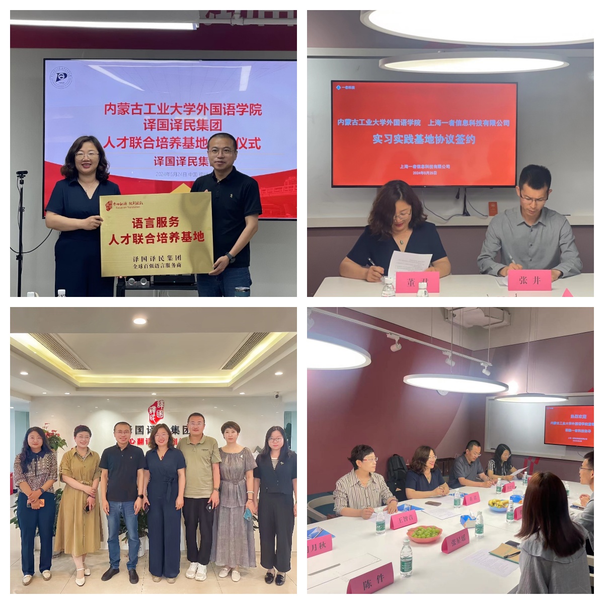 两家公司也详细介绍各自的业务范围,并表示会在学生定制化实习就业、教师教科研创新、现代化技术课程开发、特色译著出版等方面为学院提供支持,不断提升翻译人才培养质量,将校企合作落到实处。会谈后,学院与译国译民集团有限公司举行了语言服务人才联合培养基地的授牌仪式,与上海一者科技有限公司签署了《实习基地协议书》。