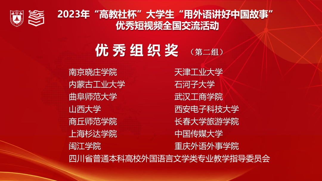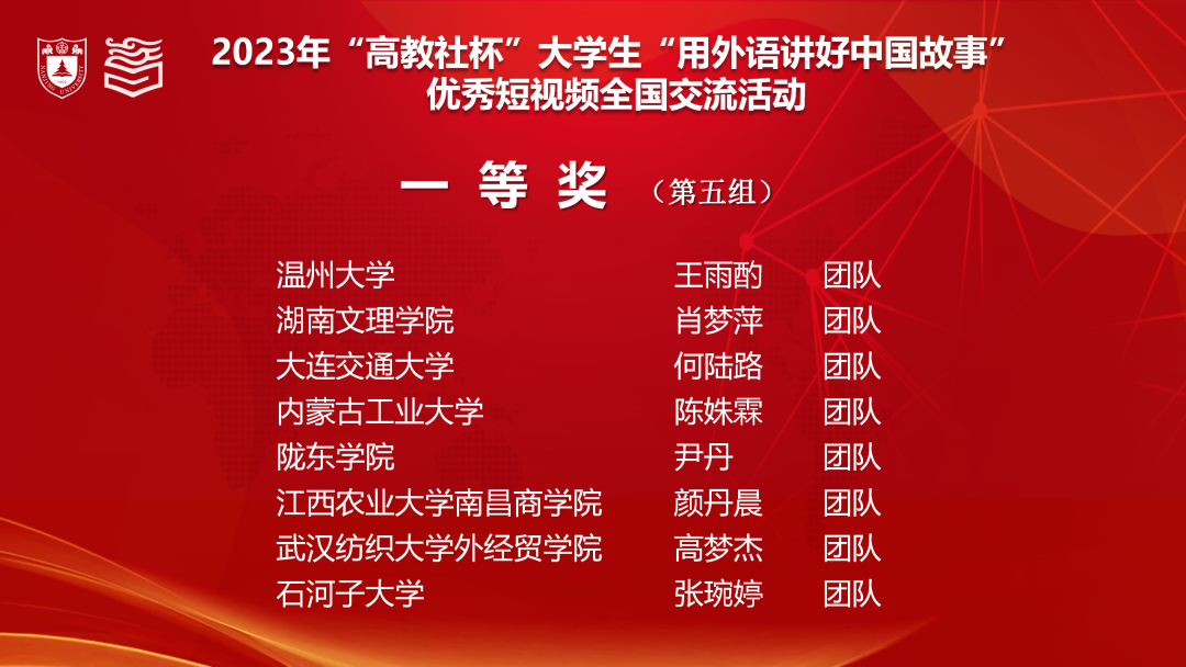 此次优秀短视频作品征集活动共有29个省市、自治区的823所高等院校参赛,通过活动官方网站提交作品5111件,省级入围728件。经过为期五个月的校级、省级评选,最终来自131所高校的145份作品进入全国交流环节,我院《酿韵:Shaoxing Huangjiu》团队以自治区特等奖晋级全国交流环节并获得一等奖。此项成绩再次彰显了我院英语专业人才培养的卓越成就。
