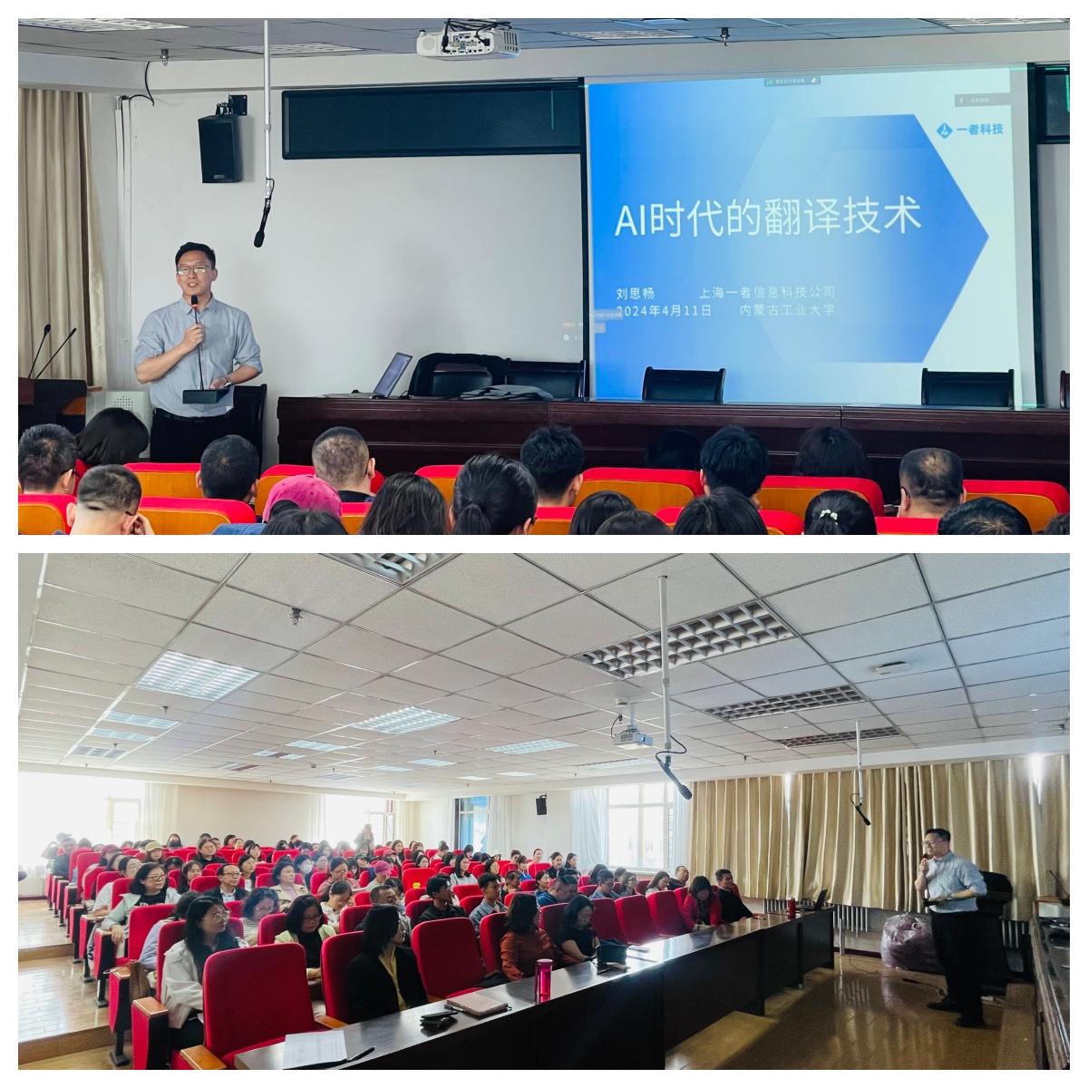 2024年4月11日下午,上海一者科技有限公司运营总监刘思畅应yL23411永利集团邀请在电力大楼400会议室做题为“AI时代的翻译技术”专题讲座,学院全体硕士生导师、翻译方向教师以及2022级、2023级研究生参加。
