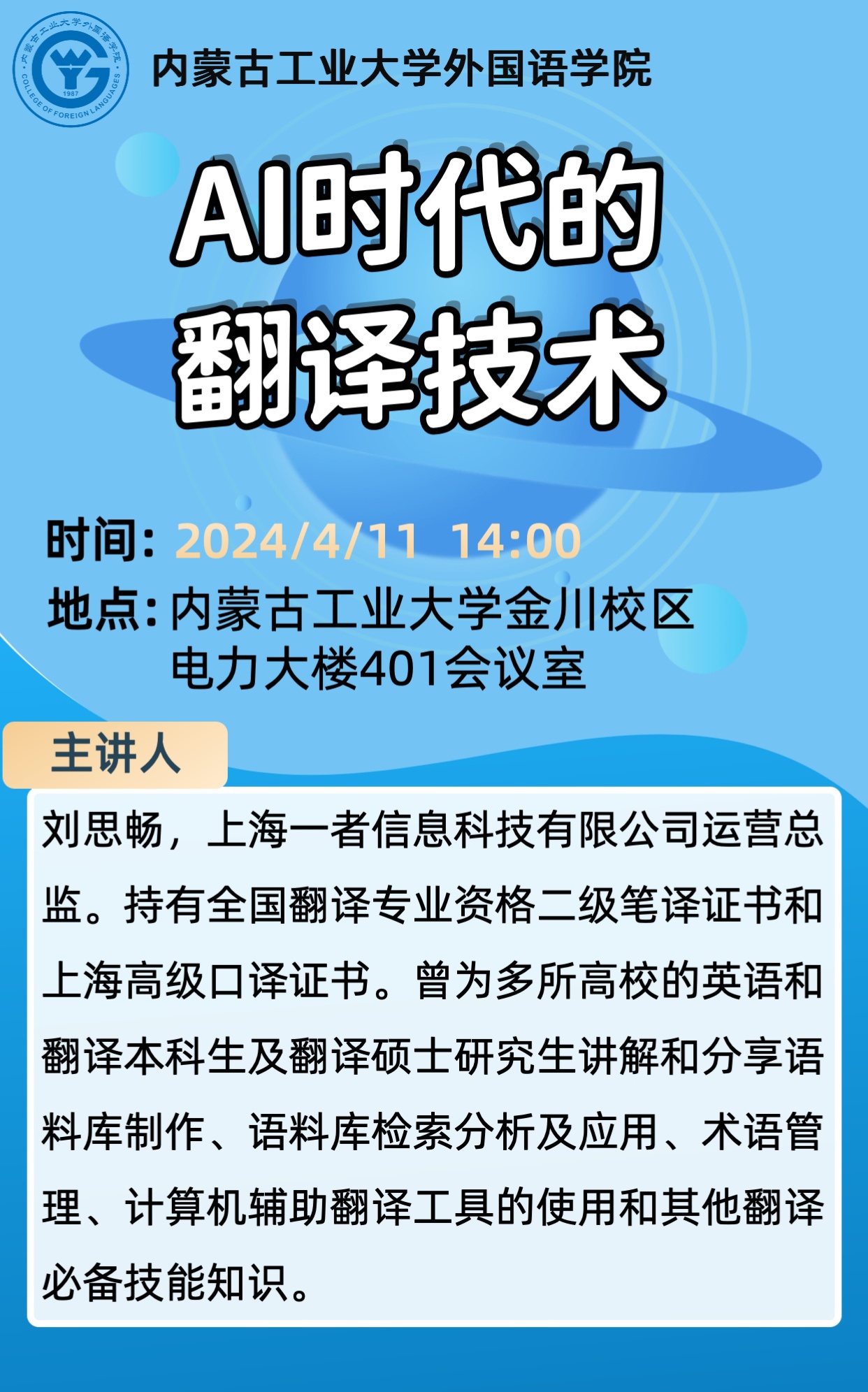本次讲座将主要介绍:在当今人工智能高速发展的时代,语言服务行业正在使用的新技术、今后的发展方向以及此行业对人才的需求,旨在对学生进行相应的就业指导。