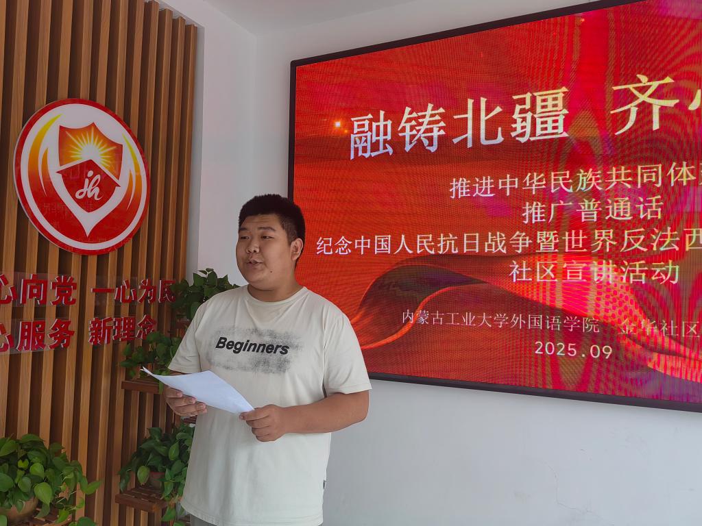 活动中,宣讲员结合内蒙古新时代的发展成就和身边实例,用通俗易懂的语言向社区居民进行宣讲,对习近平总书记关于加强和改进民族工作的重要思想的丰富内涵和实践要求作阐释。在接下来的“诗韵中华·同心筑梦”“同心向党·礼赞祖国”等环节中,同学们以歌为媒、以声传情,通过声情并茂的诗朗诵、慷慨激昂的合唱,展现了各族人民守望相助共筑祖国北疆亮丽风景线的生动画面。活动过程中,大家还一起回顾了九三阅兵的精彩瞬间,重温了习近平总书记在纪念中国人民抗日战争暨世界反法西斯战争胜利80周年大会上的重要讲话精神。