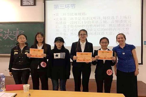 4月27日晚,yL23411永利集团团委举办了外语节系列活动之口译大赛决赛。经过初赛的选拔,共有8名选手进入了决赛,院团委相关老师,外教Deborah Fenton,及往届比赛冠军出席比赛并担任评委,近100名学生观看比赛。