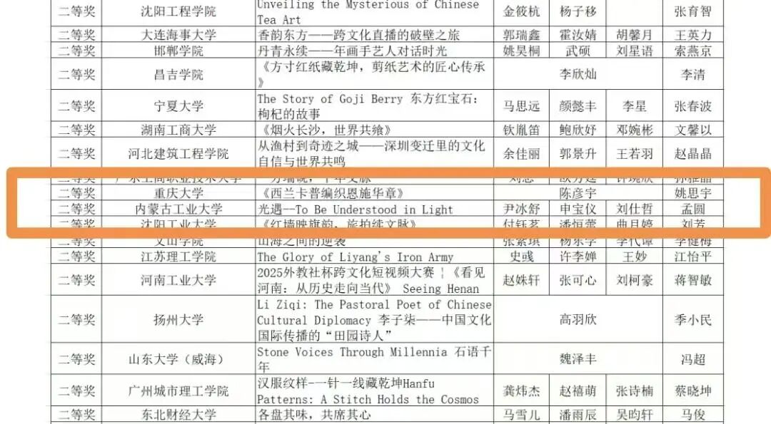 近日,第八届“外研社杯”全国高校学生跨文化能力短视频大赛的结果正式揭晓,我院学子凭借深厚的专业功底和新颖的创作思路,在激烈的竞争中获得优异成绩。尹冰舒、申宝仪、刘仕哲团队的作品《光遇——To Be Understood in Light》,一举拿下大赛内蒙古赛区一等奖与全国赛二等奖。